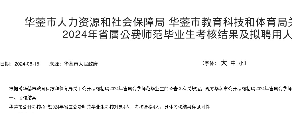 华蓥市公开考核招聘2024年省属公费师范毕业生考核对象4人,考核合格4人。具体考核结果详见附件。
