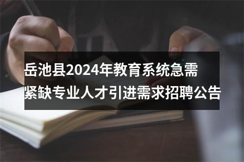 为加快推进人才强县战略,切实为岳池教育社会发展提供坚强人才支撑,岳池县决定开展2024年教育系统紧缺专业人才引进工作。现将有关事项公告如下: