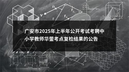 根据《广安市2025年上半年公开考聘中小学教师公告》规定,2025年上半年公开考试招聘中小学教师华蓥考点复检工作已结束,现将复检结果公告如下: